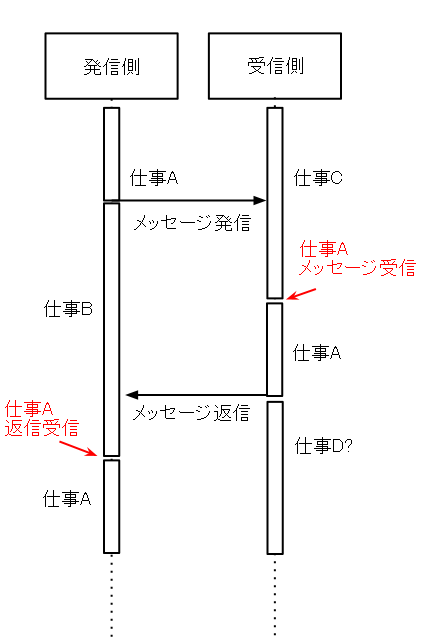 それでは、「非同期」コミュニケーションは何でしょう?非同期は発信側と受信側が仕事を平行にできる方法です。非同期コミュニケーションの場合は、仕事Aをしている発信側がメッセージを発信した後に、他に進める仕事Bに切り替えて、進めます。受信側は現在の仕事Cの切りがあった時に、発信側のメッセージを受け取って、処理して、返信を返します。そして、発信側は仕事Bの切りがあった時に、受信側の返信を受け取って、仕事Aを進めます。