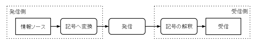 片道のコミュニケーションのプロセスでは、情報のソースからメッセージを受信側に発信しようとします。メッセージを発信する前に受信側が分かるような記号に変換します(普段の会話の場合は自然言語に変換します)。変換後に、記号を発信して、受信側はメッセージを受け取って、記号の解釈を行えます。